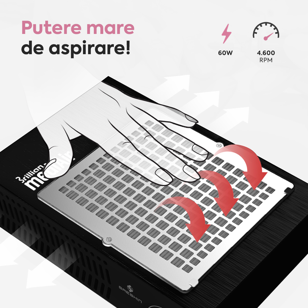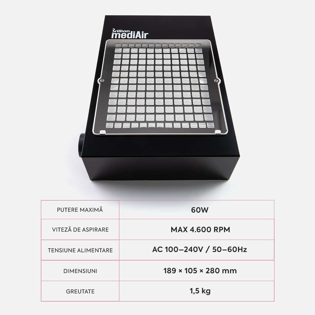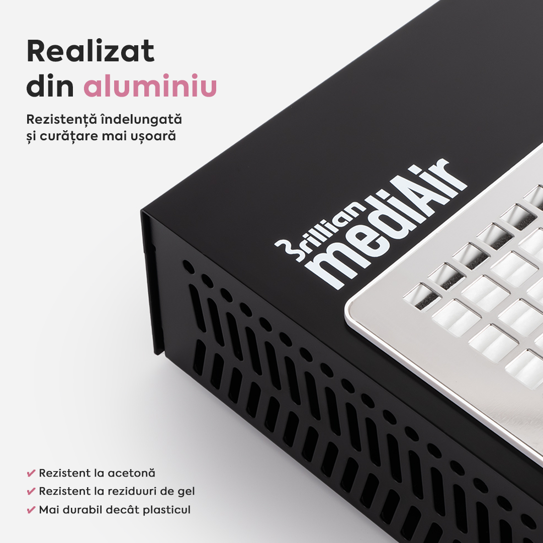 Aspiratorul pentru manichiură Brillian mediAir este un echipament profesional creat pentru a menține curățenia și igiena în saloanele de manichiură. Spre deosebire de aspiratoarele obișnuite din plastic, mediAir este construit din aluminiu durabil, rezistent la acetonă și la acumularea de reziduuri de gel, ceea ce îl face ideal pentru utilizarea intensivă.