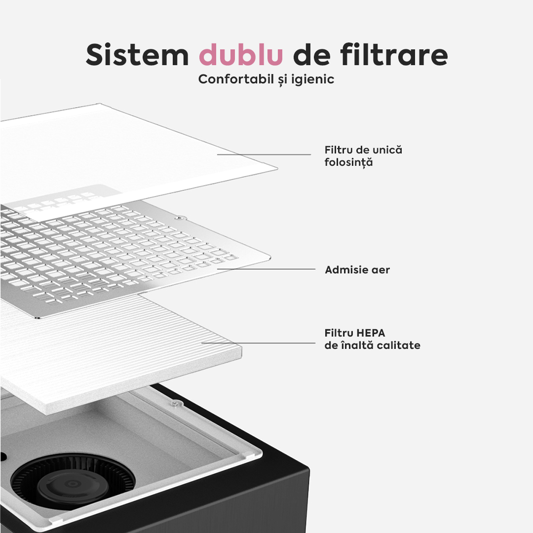 • Sistem dublu de filtrare, care captează eficient particulele fine și ultrafine de praf și menține un aer curat în salon - filtru de unică folosință și filtru HEPA de înaltă performanță;