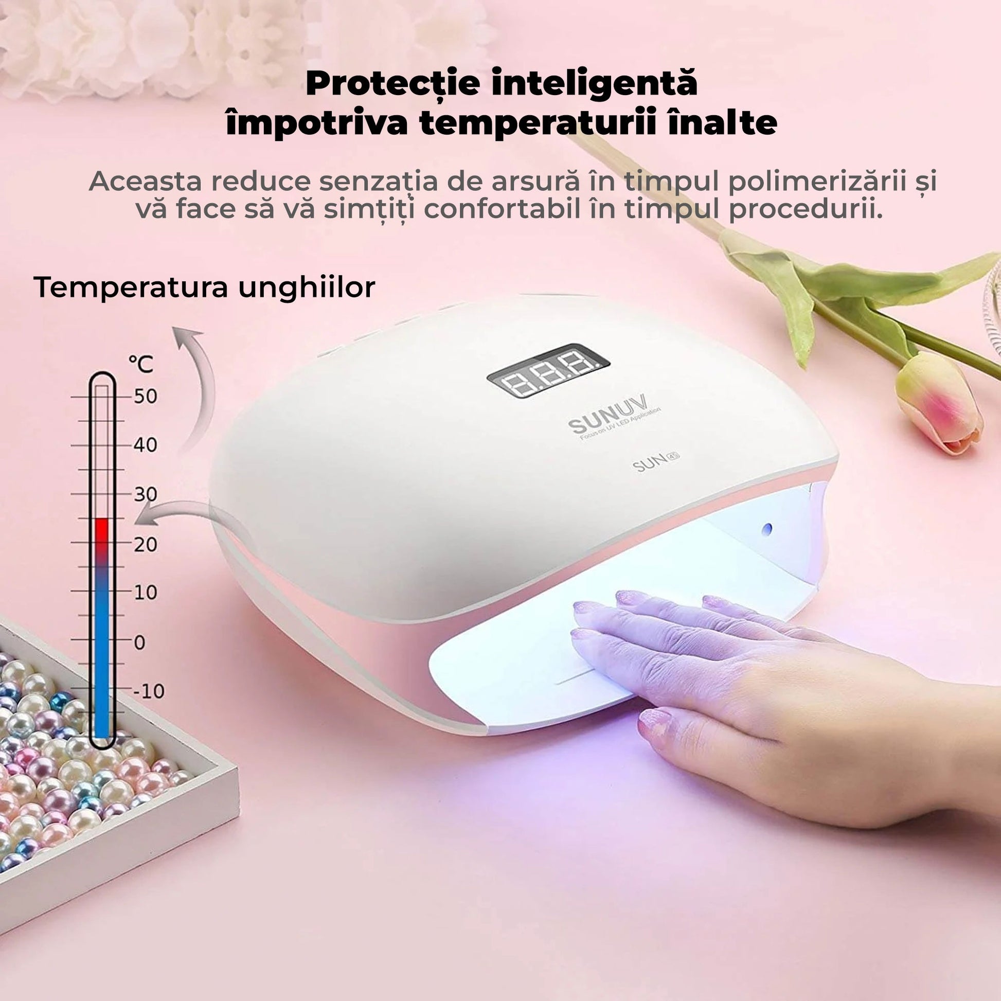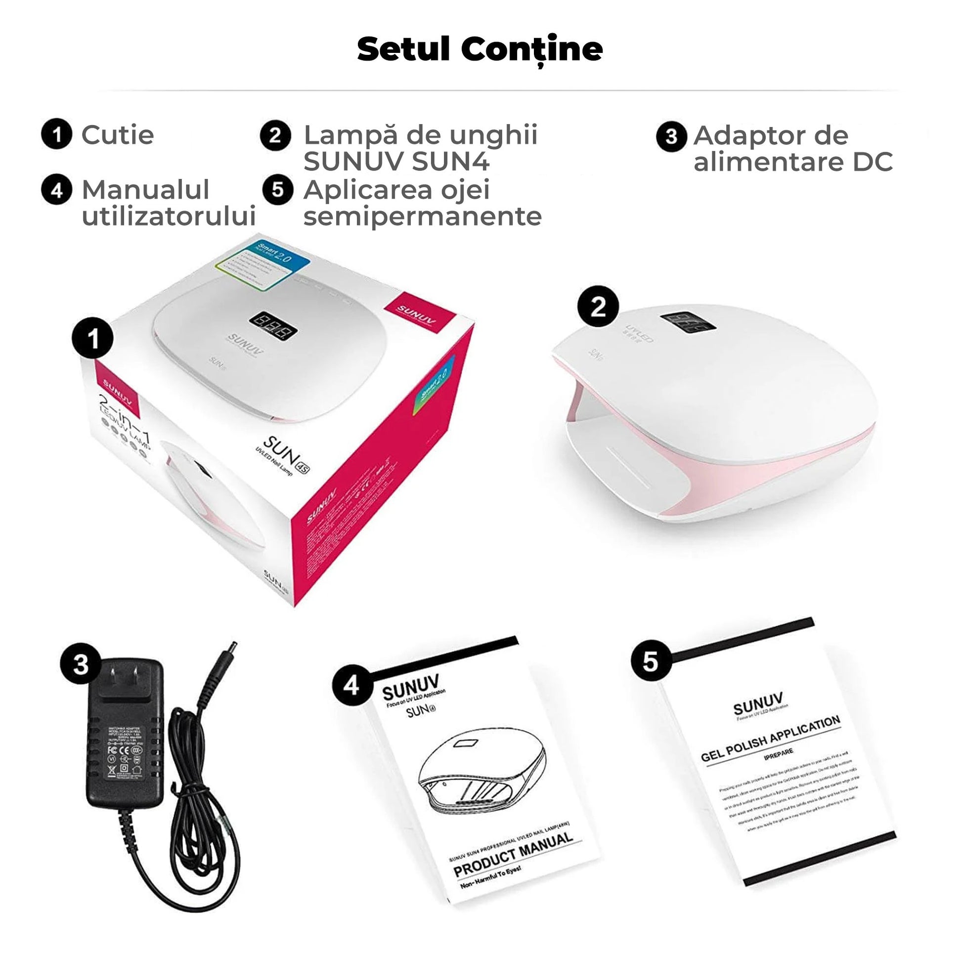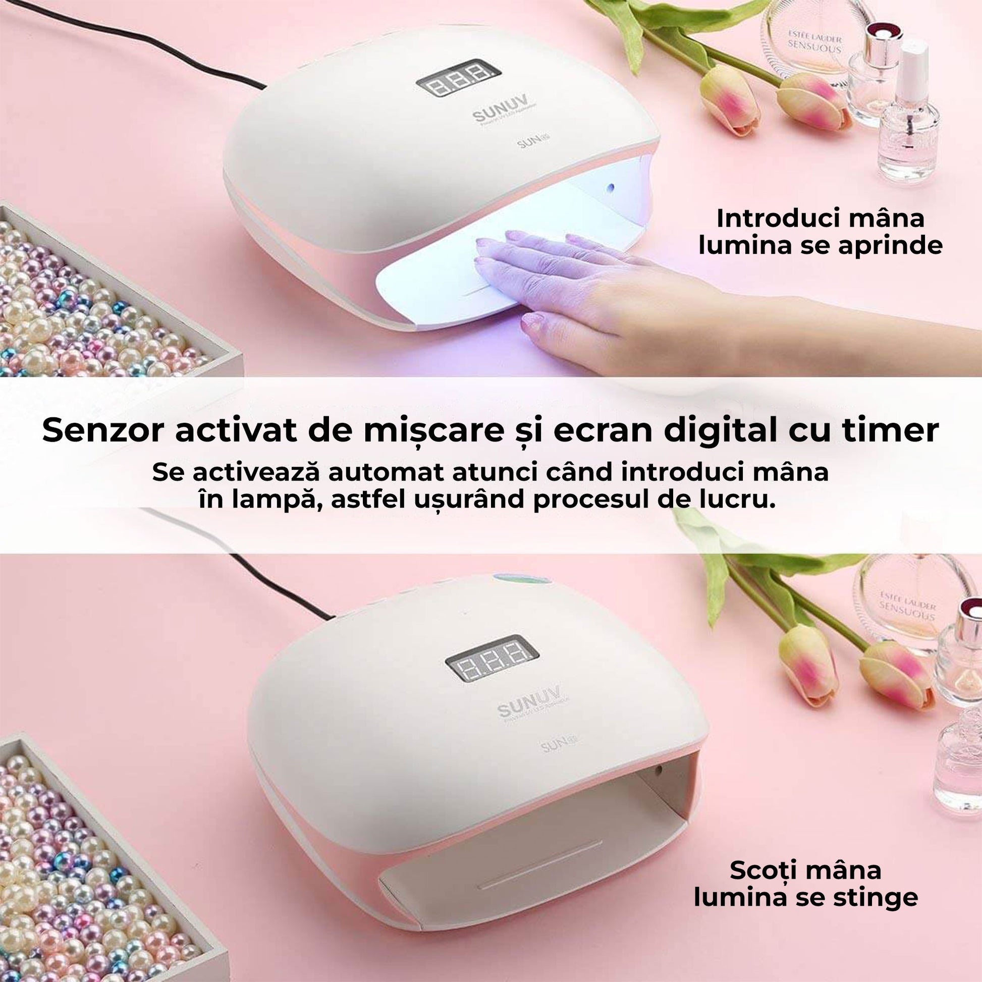 Lampa originală SUN 4S de nouă generație Smart 2.0. În 2018, SUNUV a lansat modelul SUN 4S cu detalii roz, acoperire albă în interiorul lămpii și bază detașabilă. Acum aveți mai multe modele la alegere pentru a se integra cu interiorul salonului dvs! Plasticul alb mat de înaltă calitate cu detalii roz, ecranul digital și pozițiile timer-ului sunt perfect proiectate! Spațiul intern al lămpii permite plasarea ambelor mâini în același timp, ceea ce va accelera munca tehnicianului. Baza detașabilă face ca lampa să fie ușor de utilizat inclusiv pentru pedichiură.