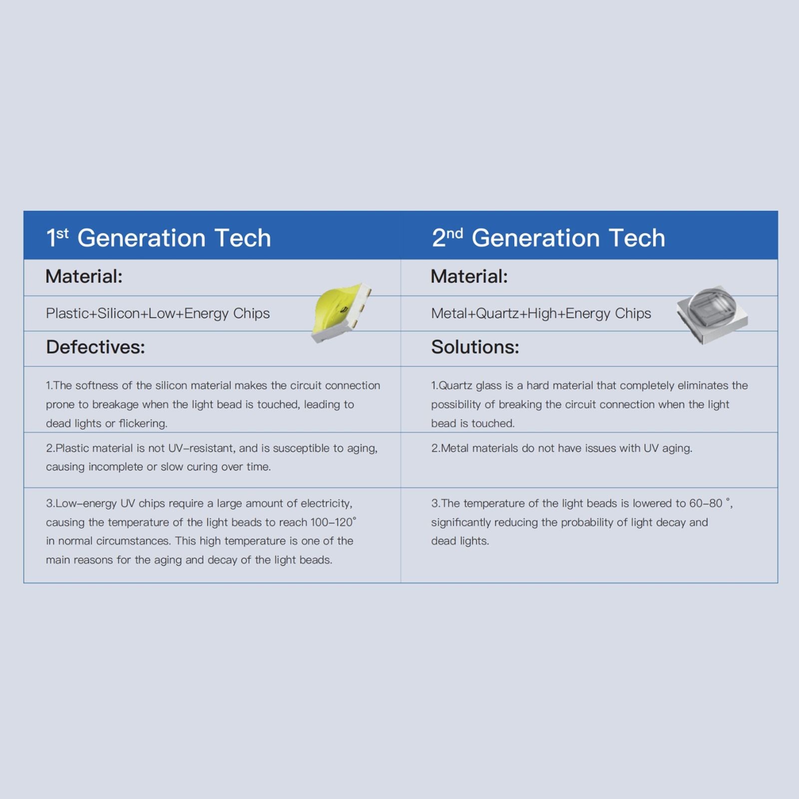 Imaginea din dreapta arată LED-urile fabricate din quarț și metal (a 2-a generație), fiind mai robuste și cu o calitate superioară. De asemenea, s-a mărit dimensiunea cipurilor LED pentru a obține mai multă energie UV, astfel încât acestea sunt de două ori mai puternice decât vechile LED-uri galbene.