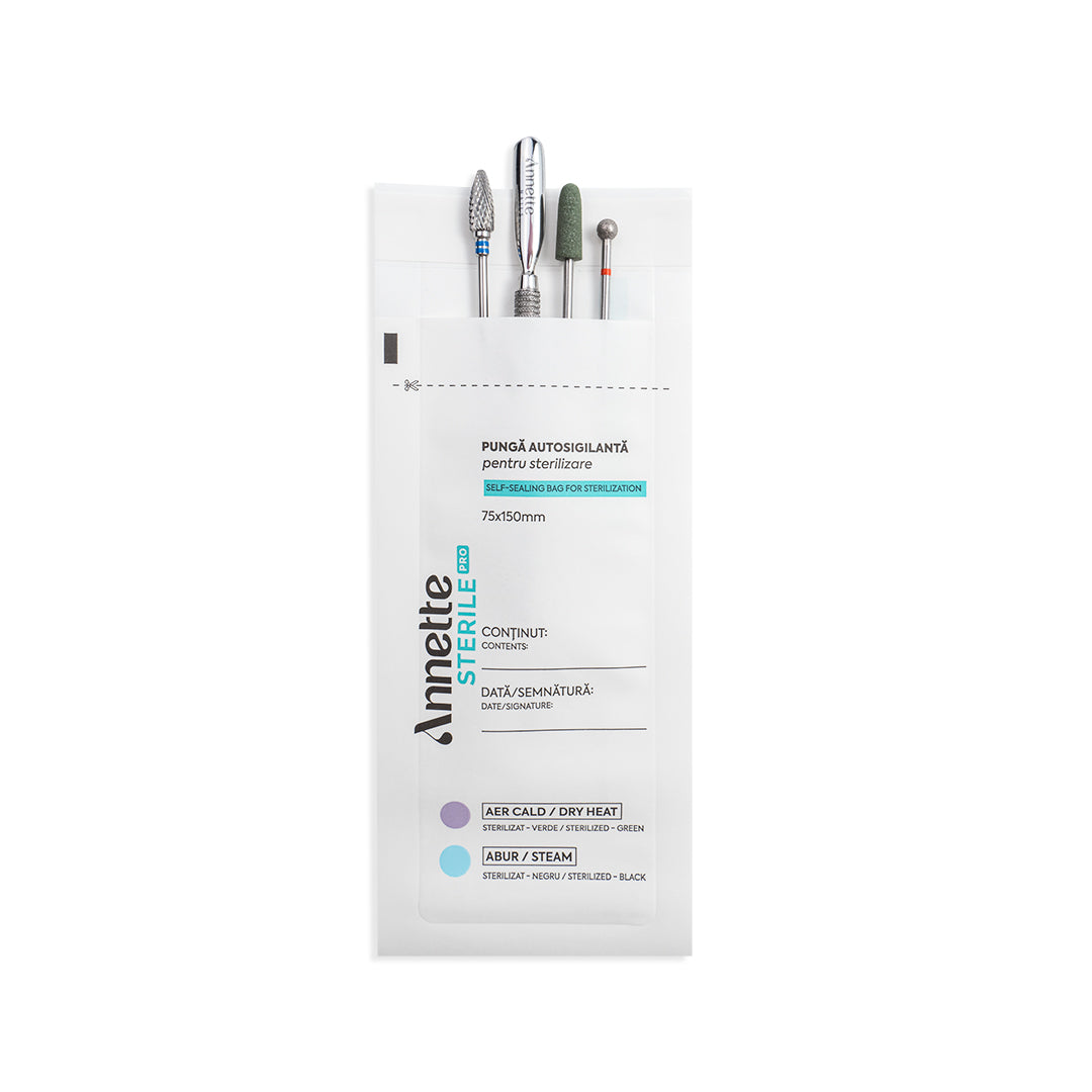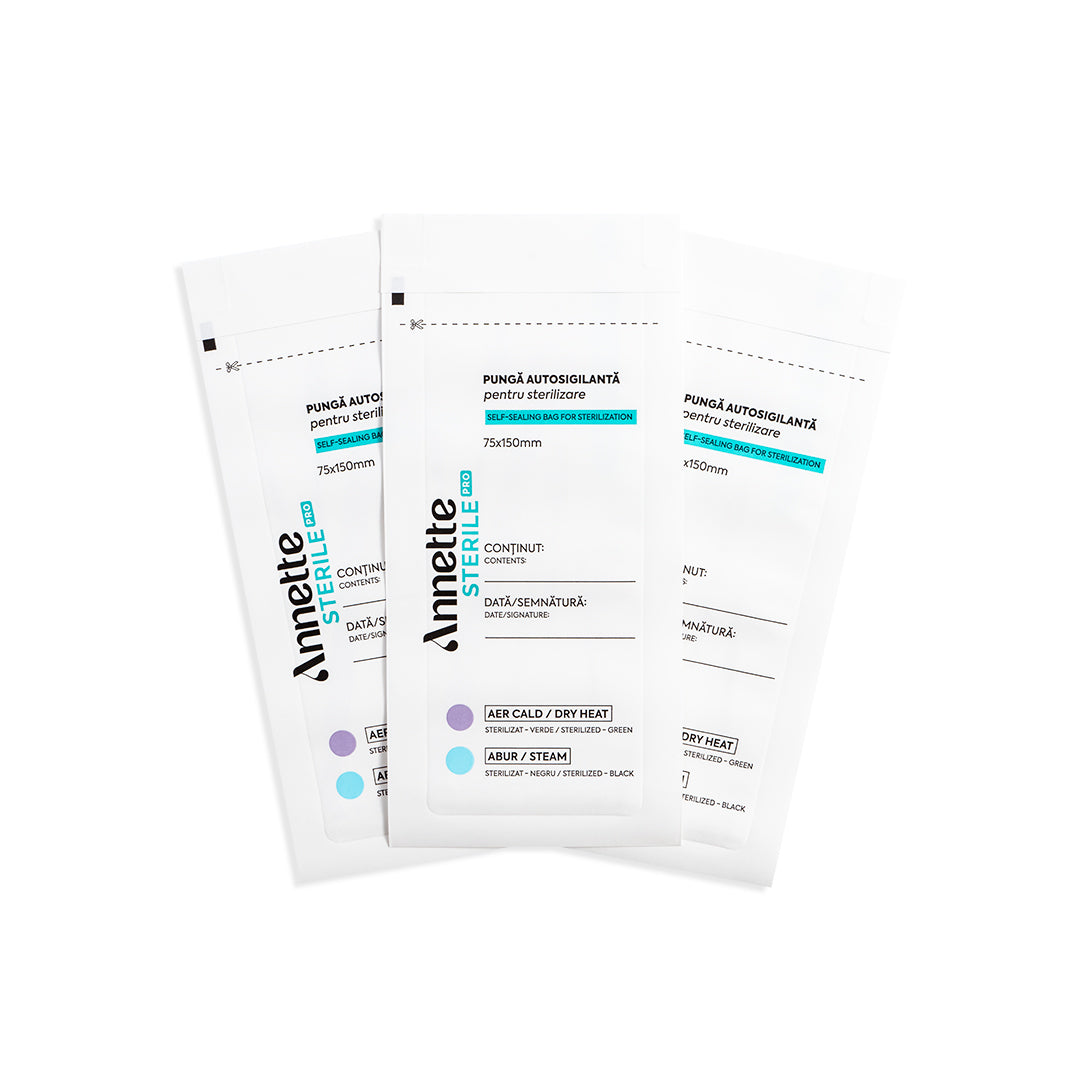 Pungile Annette Sterile Pro cu dimensiunile de 75 x 100 mm sunt folosite pentru sterilizarea pusherelor și a diferitor capete de freze. În plus, acestea sunt practice, nu se rup și asigură protecția instrumentelor în timpul transportului și depozitării. După sterilizare pungile asigură o protecție eficientă de 1-2 luni (pupinel/autoclav) împotriva contaminărilor chimice și biologice ale instrumentelor, reprezentând un produs esențial în trusa fiecărui tehnician. Odată folosite, pungile nu mai pot fi reutilizate.