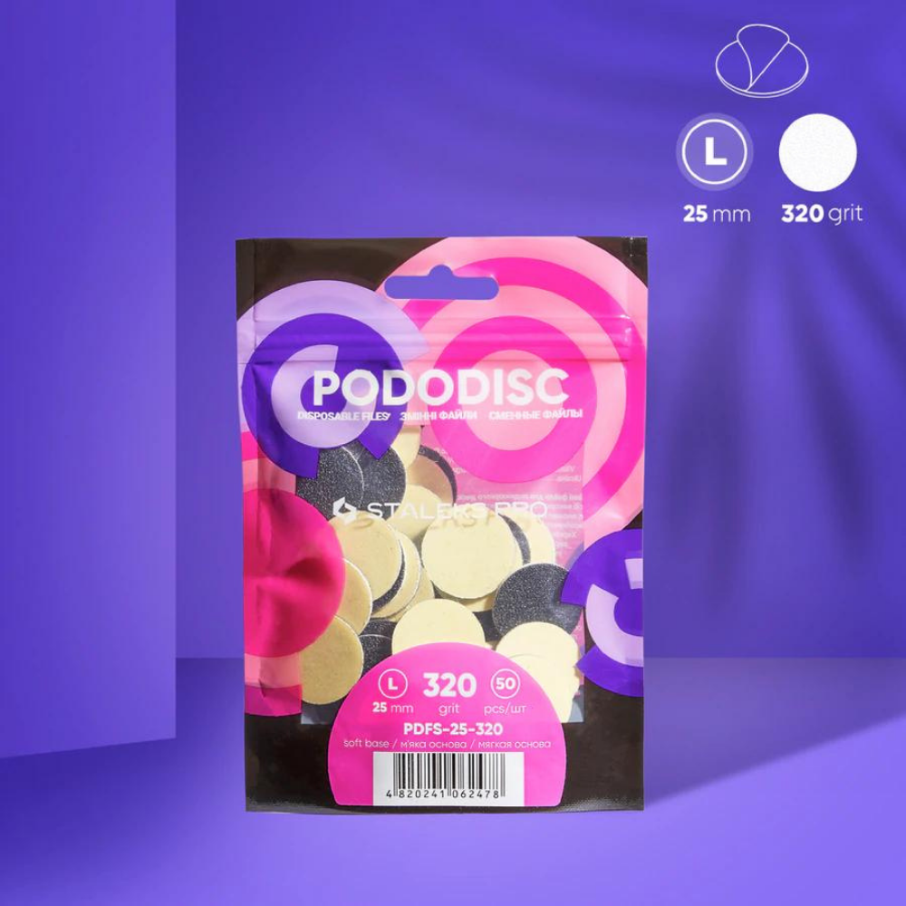 Rezervele pododisc au un abraziv de înaltă calitate și un suport adeziv puternic. Sunt rezistente la umiditate - pila nu își schimbă proprietățile la prelucrarea piciorului cu utilizarea produselor de îngrijire. Produsul este de unică folosință.Abrazivitate: 320 grit