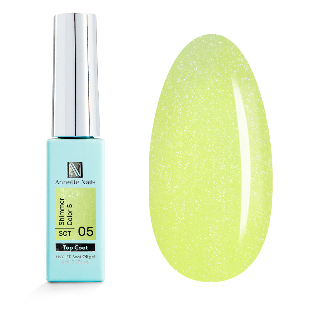 Colecția Top Coat Shimmer Color Annette Nails adună top coat-uri color fără strat de dispersie, cu aspect translucid, îmbogățite cu particule fine de sclipici argintiu. Top coat-ul poate fi aplicat peste o culoare fără efect, complementară sau similară acestuia sau direct peste gelul de construcție, polygel, bază rubber, fapt ce îl face ideal în pedichiură, deoarece se reduce efectul de volum al unghiei. Consistența top coat-urilor este una medie spre lichidă, ceea ce le face comode în aplicare.