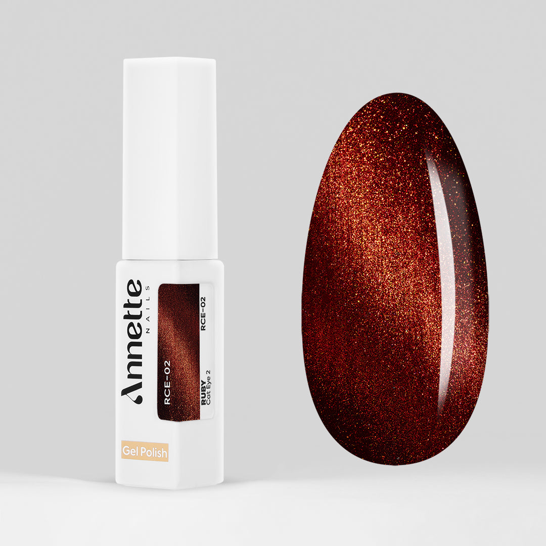Ruby cat eye - o colecție de culori magnetice (cat eye), care își intensifică culoarea sub acțiunea razelor directe ale soarelui. După aplicarea culorii Ruby cat eye, se apropie magnetul de suprafața unghiei, iar particulele reacţionează instantaneu la magnet. Consistența cremoasă, ușor fluidă, permite o aplicare ușoară, ce se autonivelează rapid.
