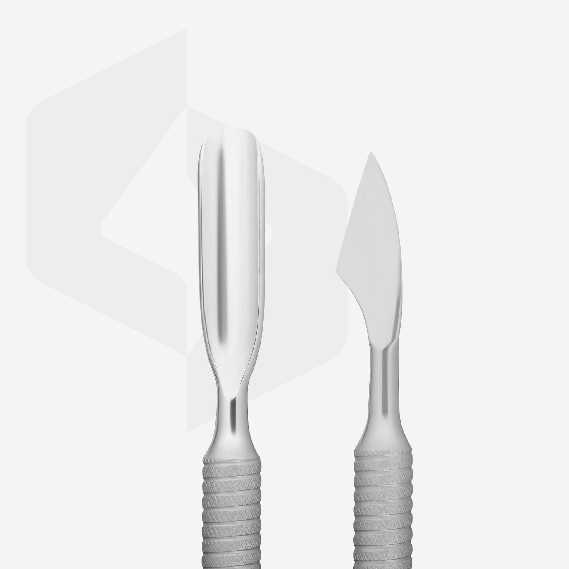 Pusher Smart Staleks - PS-50/2 este un instrument cu 2 capete, conceput pentru lucrul asupra cuticulei. Primul capăt are rolul de a ridica si împinge înapoi cuticula, în timp ce al 2-lea curăță placa unghială. Instrumentul este ascuțit manual, un avantaj esențial în timpul lucrului. Are un mâner ergonomic, antiderapant, care oferă o aderență excelentă. Suprafața mată a mânerului, îl face plăcut la atingere. Acest instrument este recomandat atât pentru pedichiură, cât și pentru manichiură.Material: Oțel inoxidabil 08Х18Н10 (AISI 304)